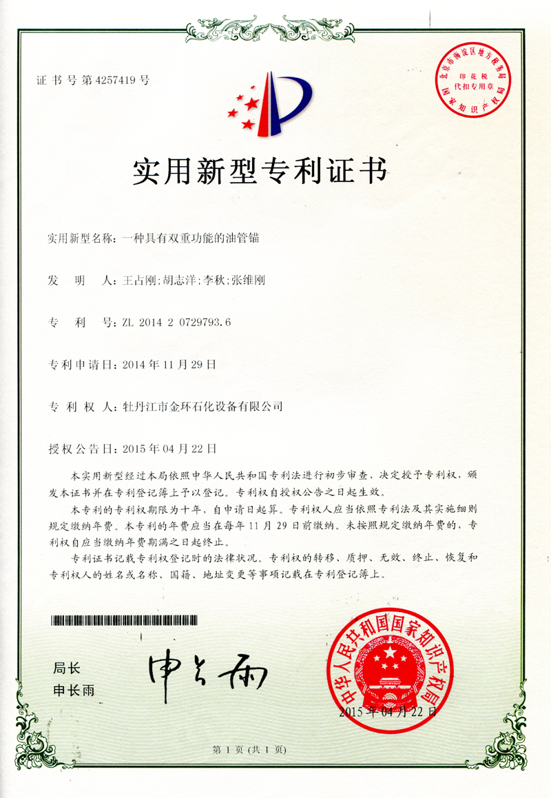 一種具有雙重功能的油管錨實(shí)用新型專利證書ZL 2014 2 0729793.6